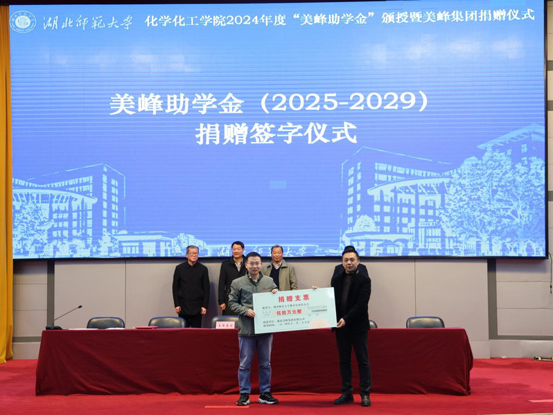 余涛与曾铁鸣共同为2023年获资助的在校9名同学颁授证书、为2024年获资助的10名同学颁发助学金及证书。根据2020年设立“美峰助学金”协议,第一期“美峰助学金”已满五年,学院共50人次在校期间获得资助,其中已有26名受助学生顺利完成学业,9名毕业生顺利考上硕士研究生继续深造。为了庚续回馈母校、捐资助困的企业社会责任,曾铁鸣董事长及美峰集团经研究,决定继续设立“美峰助学金”并扩大资助额度和范围,在未来五年面向化学化工学院贫困学子,捐赠50万元用于资助100名品学兼优的贫困学子。会上,美峰集团代表、湖北美峰化学有限公司总经理柯生辉、湖北师范大学教育发展基金会秘书长、校友工作处处长刘洋,分别代表美峰集团及湖北师范大学教育发展基金会签订捐赠协议。
