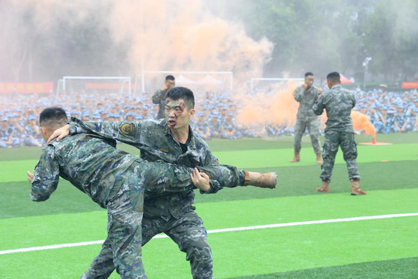 武警黄石支队的教官们则带来了虎虎生风的擒敌拳展示,动作刚劲有力,呐喊声震天动地,充分展现了新时代军人的过硬本领和英勇风采。