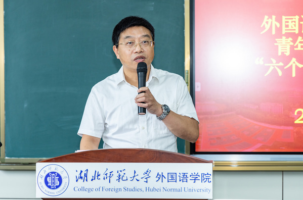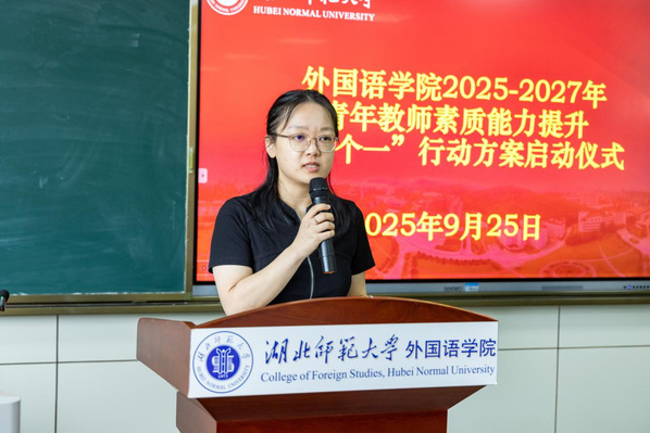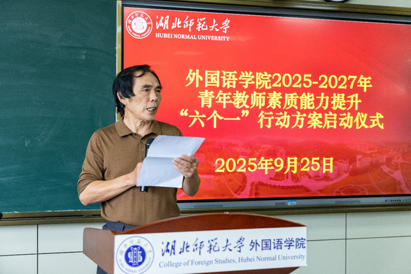 本网讯 9月25日下午,湖北师范大学外国语学院在人文楼21B602隆重举行青年教师素质能力提升“六个一”行动方案启动仪式。校党委常委、统战部部长肖六亿出席会议并讲话。华中科技大学外国语学院教授、博士生导师彭仁忠受邀出席,人事处、教务处、研究生院相关负责人,外国语学院领导班子成员、院长助理、各系部主任、教研室主任、研究生导师、2023-2025年新进教师、博士教师及硕士研究生代表参加活动。会议由外国语学院院长刘敏主持。