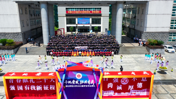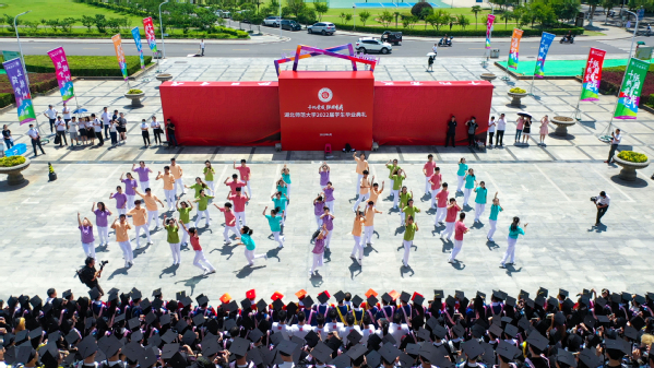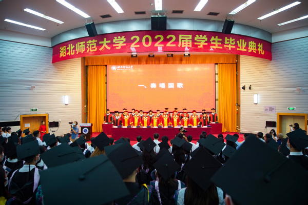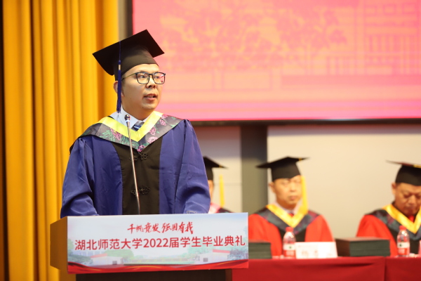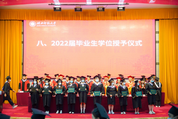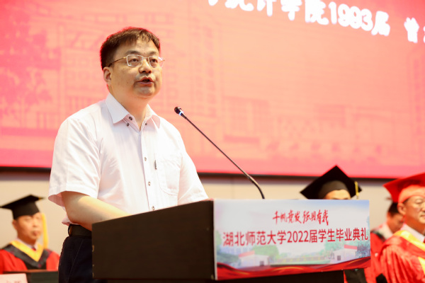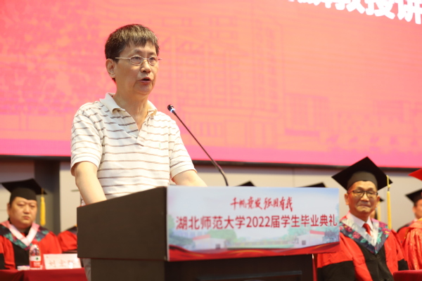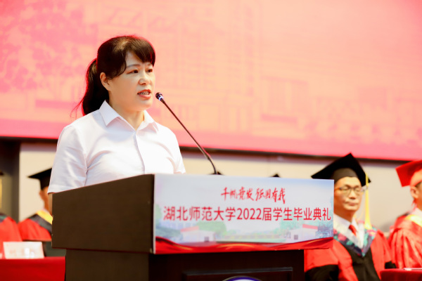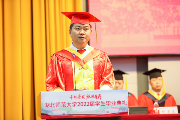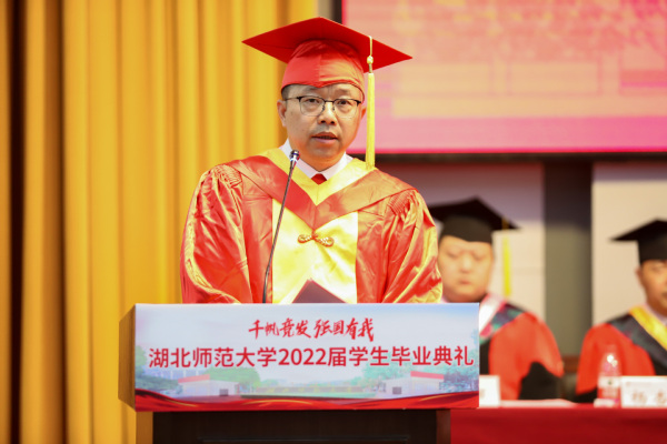 典礼最后,校长李宏教授致辞。他代表学校向5108名本科生和281名硕士研究生圆满完成学业表示热烈祝贺,勉励毕业生奔流入海、云程发轫,在广阔的舞台和光明的未来中接受考验和挑战,并对即将踏上人生新征程的同学们提出三点期盼:一是恪守初心、心怀家国,做矢志不移的爱国者;二是坚守梦想、投身实践,做不负时代的实干者;三是固守本真、勇于探索,做超越自我的奋斗者。他希望广大毕业生秉承“自强不息 尚诚厚德”的湖师精神,始终踏歌而行,勇敢向未来,在青春的赛道上奋力奔跑,真正成为复兴栋梁、强国先锋。