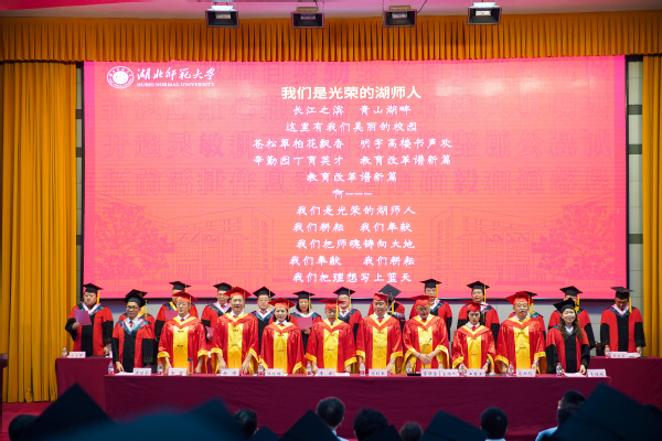 典礼上,为进一步增强毕业生的爱校荣校之情,为50周年校庆预热,特邀请了文学院退休老教师、石麟教授为大家讲述湖师故事,一同“走过湖师的岁月”。全场师生还合唱《我们是光荣的湖师人》,为毕业典礼画上圆满句号。