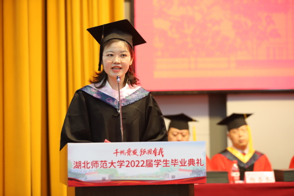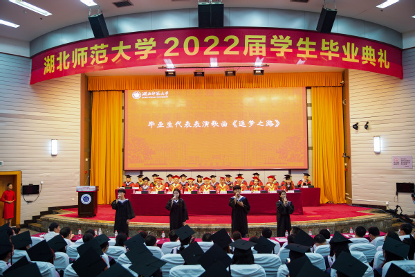 先进材料研究院研究生陈西煜、外国语学院本科生戴思晴作为优秀毕业生代表依次发言。他们表达了对母校、师长的感恩、不舍与美好祝福,并表明在今后的学习工作生活中会继续发扬湖师精神,续写新的青春篇章。随后,毕业生代表以歌抒情,演唱《追梦之路》。